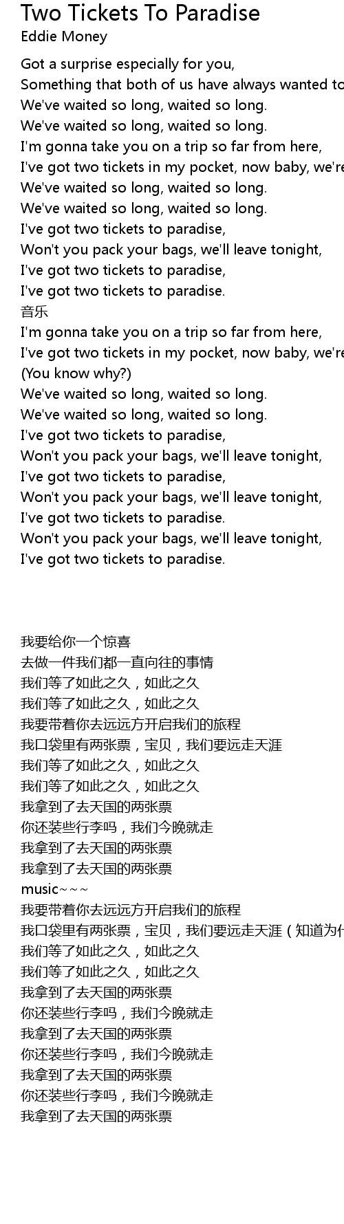 | [01:14.92] | I' ve got two tickets to paradise, |