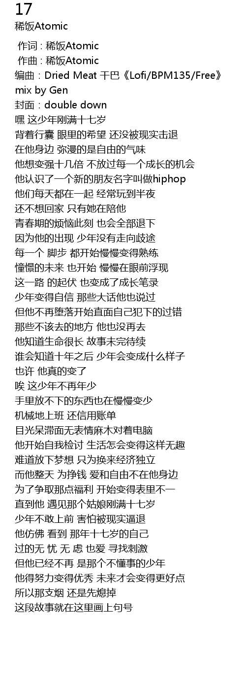 | [00:01.932] | 编曲:Dried Meat 干巴《Lofi/BPM135/Free》 |