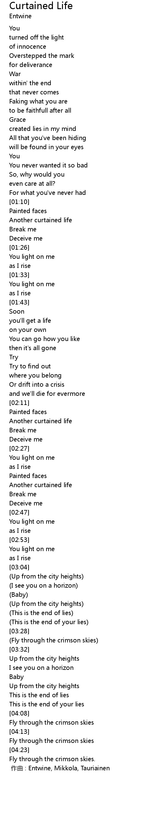 | [00:00.00] | 作曲 : Entwine, Mikkola, Tauriainen |