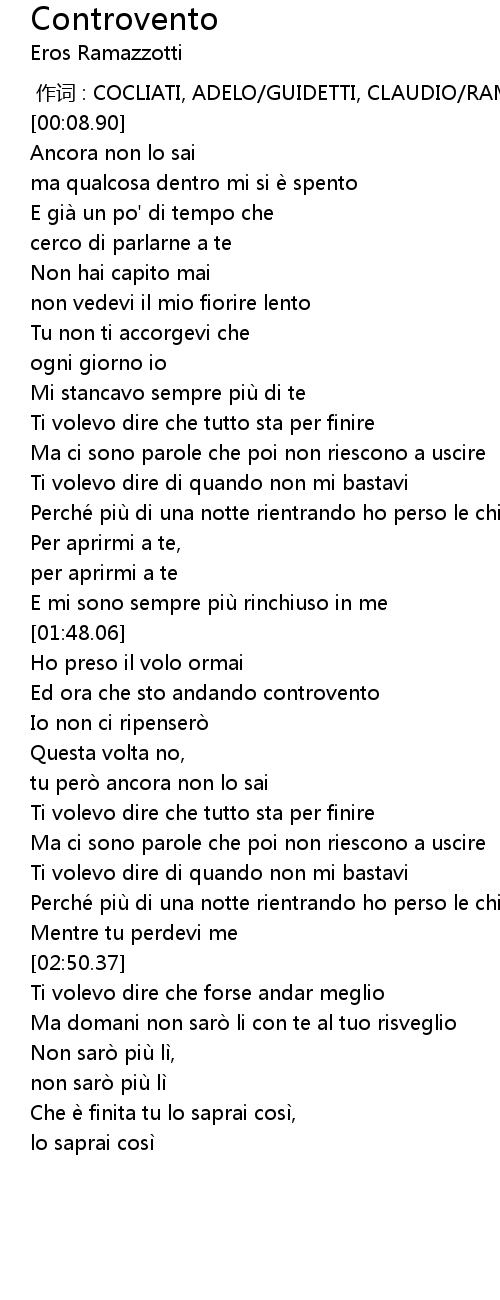 | [00:00.00] | 作词 : COCLIATI, ADELO/GUIDETTI, CLAUDIO/RAMAZZOTTI, EROS |