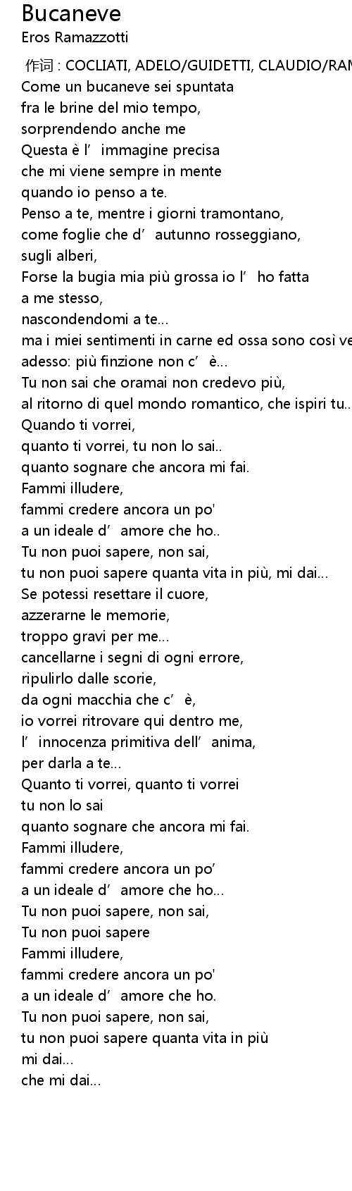 | [00:00.00] | 作词 : COCLIATI, ADELO/GUIDETTI, CLAUDIO/RAMAZZOTTI, EROS |