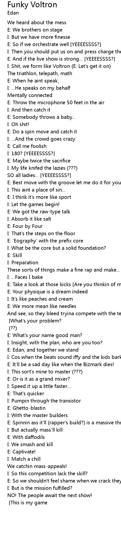 I: Shit, we form like Voltron (E: Let's get it on) |