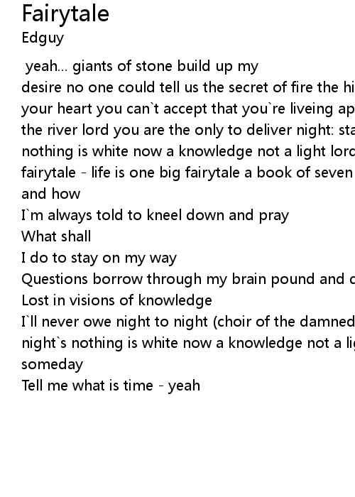 [music & lyrics: Tobias Sammet & Edguy] yeah... giants of stone build up my desire no one could tell us the secret of fire the hinger for wisdom deep in your heart you can`t accept that you`re liveing apart water runs down through the river lord you are the only to deliver night: stay night in the night`s nothing is white now a knowledge not a light lord, will you tell me why someday fairytale - life is one big fairytale a book of seven seals someone tell me why and how |