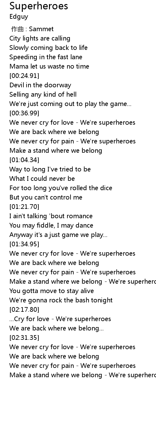 | [00:37.10] | We never cry for love We' re superheroes |