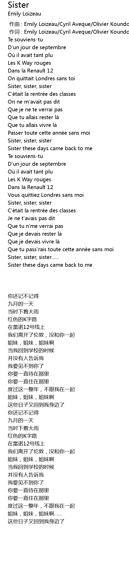 | [00:01.00] | zuò cí : Emily Loizeau Cyril Aveque Olivier Koundouno |