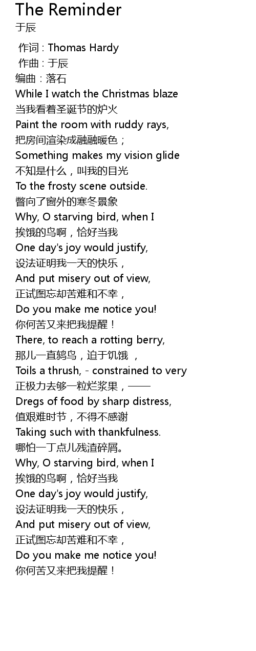 | [00:59.684] | 那儿一直鸫鸟,迫于饥饿 , |