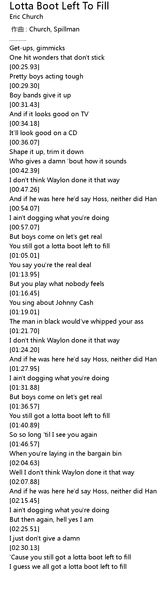| [02:32.82] | 'Cause you still got a lotta boot left to fill |