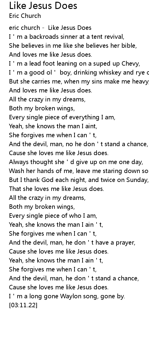 | [02:54.80] | Cause she loves me like Jesus does. |