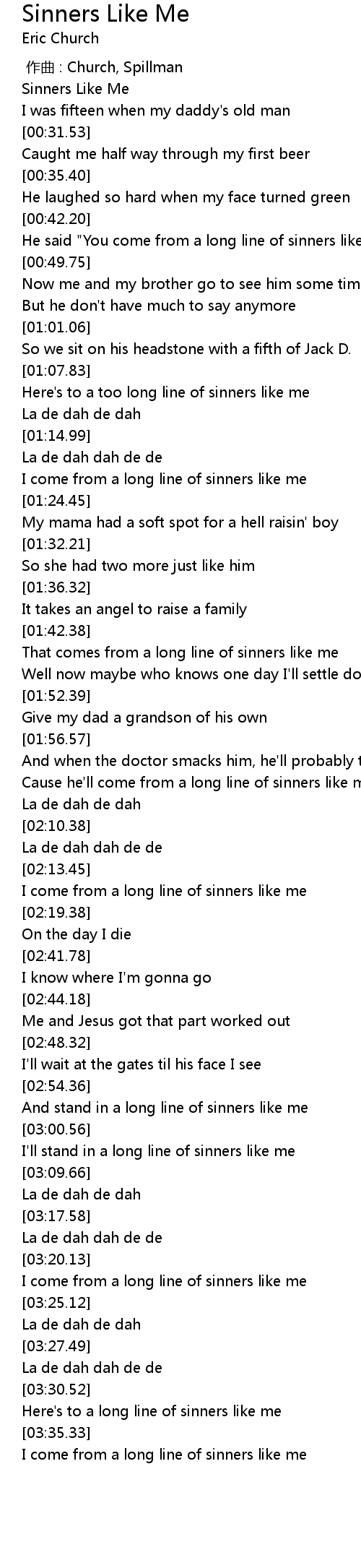 | [00:43.76] | He said "You come from a long line of sinners like me" |