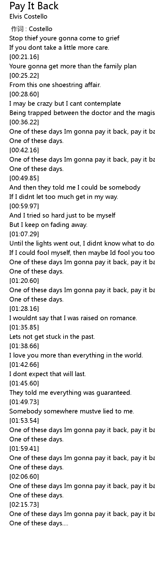 | [02:18.10] | One of these days Im gonna pay it back, pay it back |