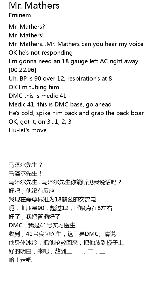 | [00:10.59] | Mr. Mathers...Mr. Mathers can you hear my voice? |