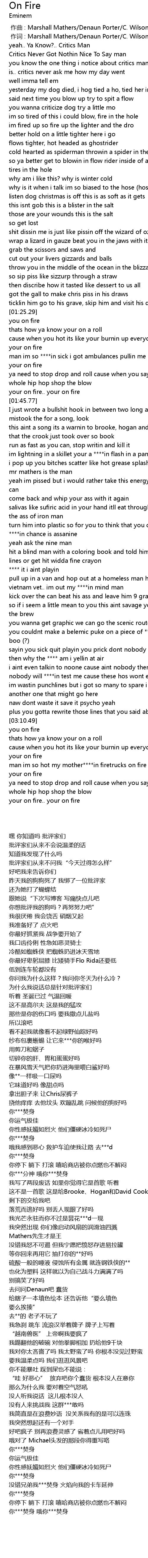 | [03:16.55] | 没错兄弟我***焚身 火焰向我的卡车延伸 |