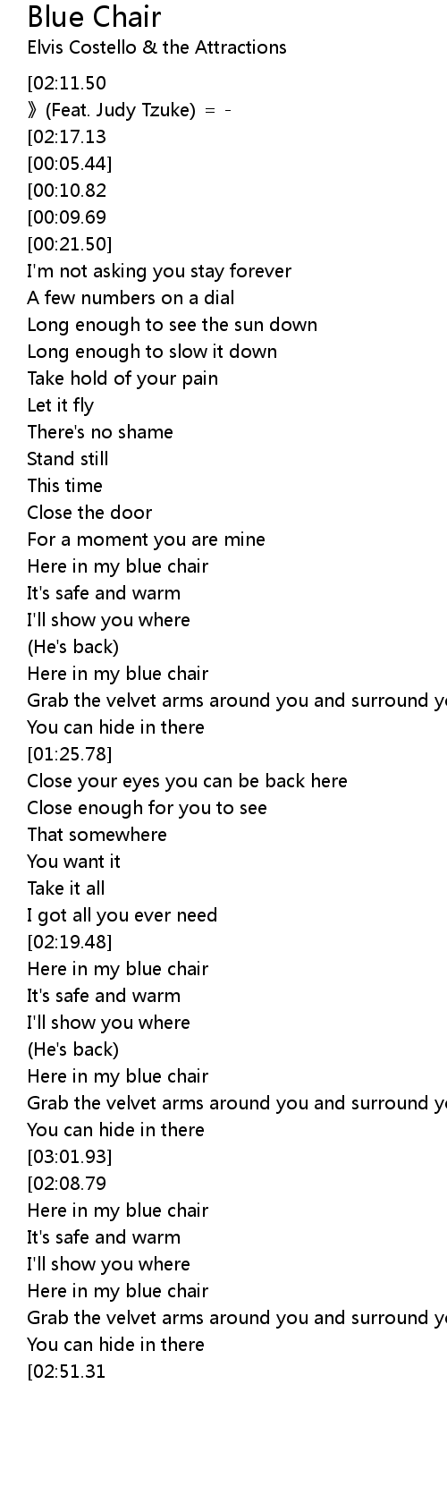 | [02:53.99][02:11.50][00:12.80][00:00.00] | Morcheeba Blue Chair Feat. Judy Tzuke |