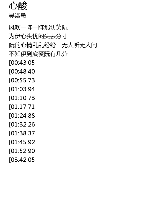 | [03:35.27][01:52.90] | 冷冷清清谁知阮无望的心酸 |