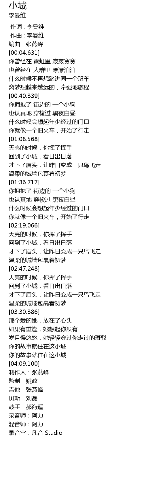 | [04:01.674] | ni de gu shi jiu zhu zai zhe xiao cheng |