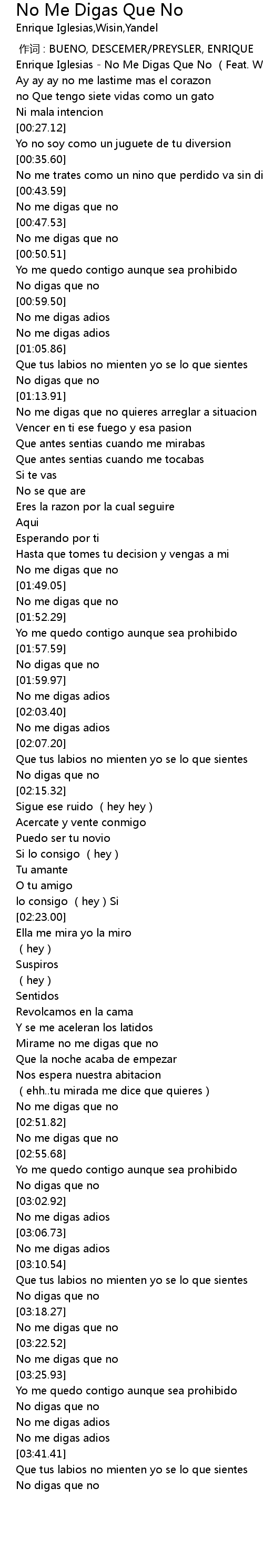 | [00:02.74] | Enrique Iglesias No Me Digas Que No Feat. Wisin Yandel |