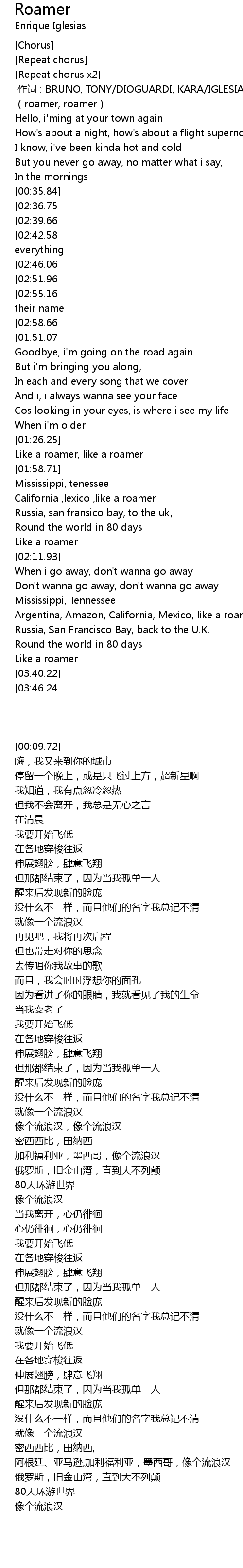 | [03:30.58] | Argentina, Amazon, California, Mexico, like a roamer |