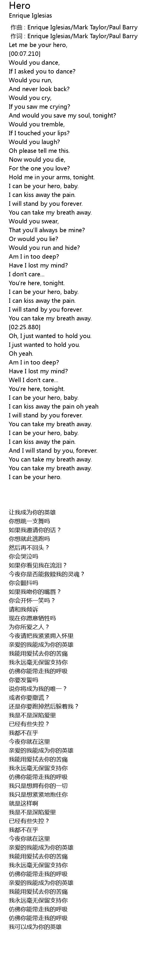 | [00:01.00] | 作词 : Enrique Iglesias/Mark Taylor/Paul Barry |
