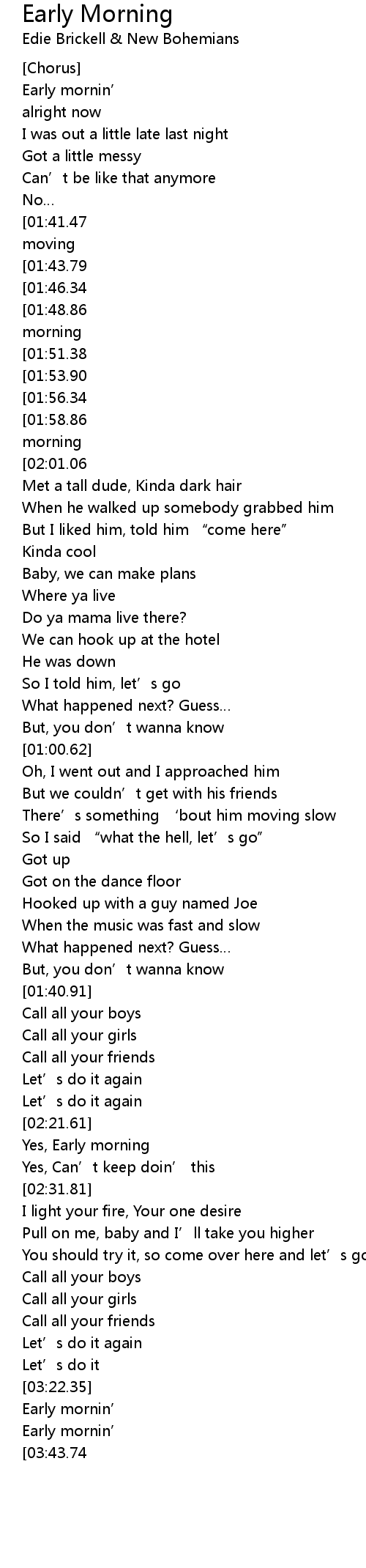 | [02:59.53][01:58.86][01:18.44][00:37.87] | And it don’t stop till the early morning |