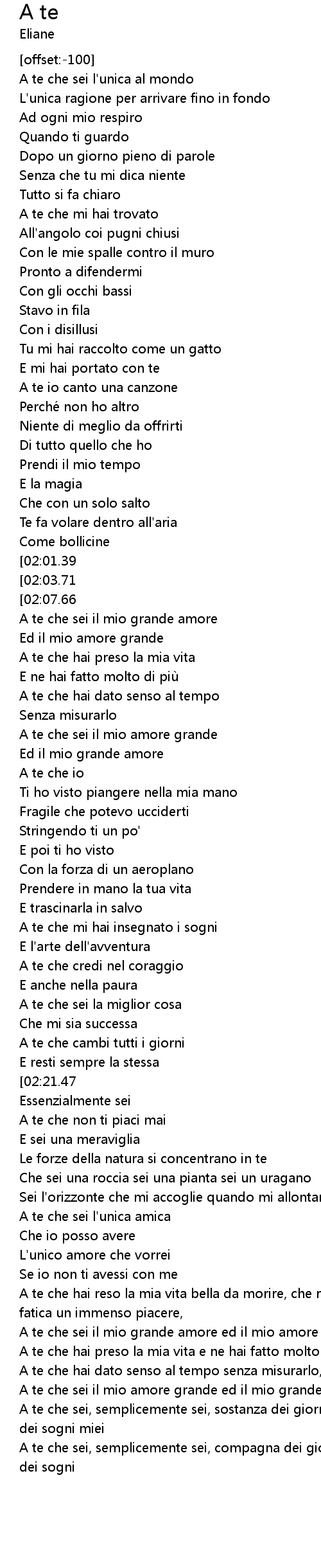 | [03:12.01] | A te che sei, semplicemente sei, sostanza dei giorni miei, sostanza dei sogni miei |