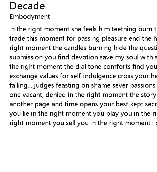 in the right moment she feels him teething burn the pictures of days gone by trade this moment for passing pleasure end the hour with even scores in the right moment the candles burning hide the question in one more thought with submission you find devotion save my soul with sudden good-byes falling... in the right moment the dial tone comforts find your peace beneath tainted sheets exchange values for self-indulgence cross your heart with fleeting dreams falling... judges feasting on shame sever passions on end children weeping for one vacant, denied in the right moment the story's ending try your soul on another page and time opens your best kept secrets plead the fifth now before you lie in the right moment you play you in the right moment you slay you in the right moment you sell you in the right moment i save you a decade late...