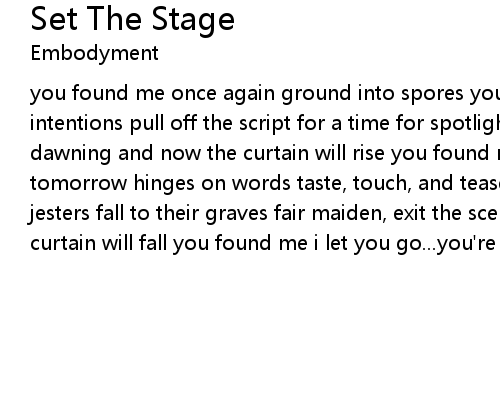 | you found me once again ground into spores your lipstick matches your dark intentions pull off the script for a time for spotlight banners will soon be dawning and now the curtain will rise you found me i let you go...you're on tomorrow hinges on words taste, touch, and tease your way through the door court jesters fall to their graves fair maiden, exit the scene of my world and now the curtain will fall you found me i let you go...you're on |
