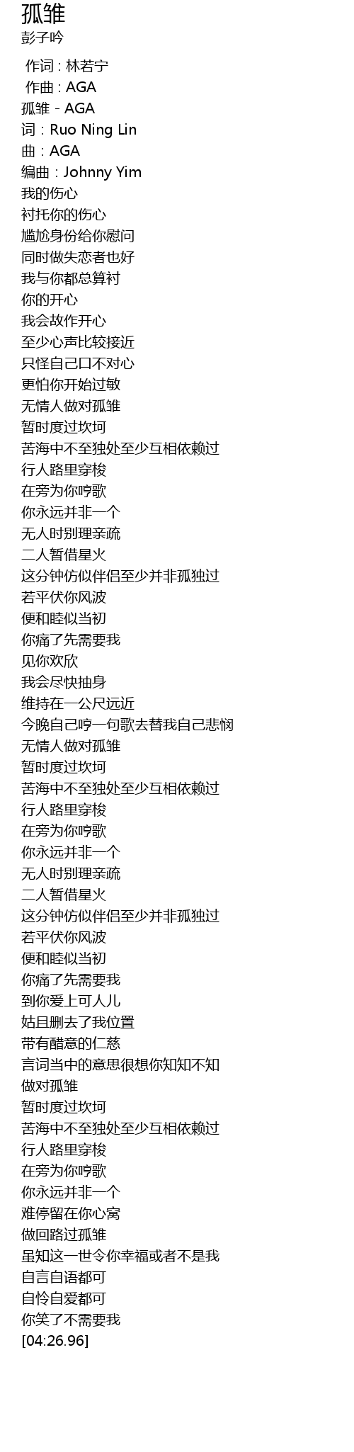 | [02:59.56] | zhè fēn zhōng fǎng sì bàn lǚ zhì shǎo bìng fēi gū dú guò |