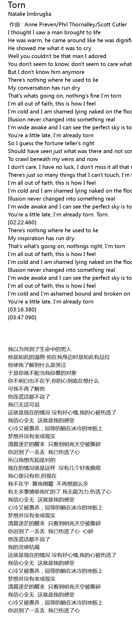 | [02:07.360] | You're a little late, I'm already torn. Torn. |