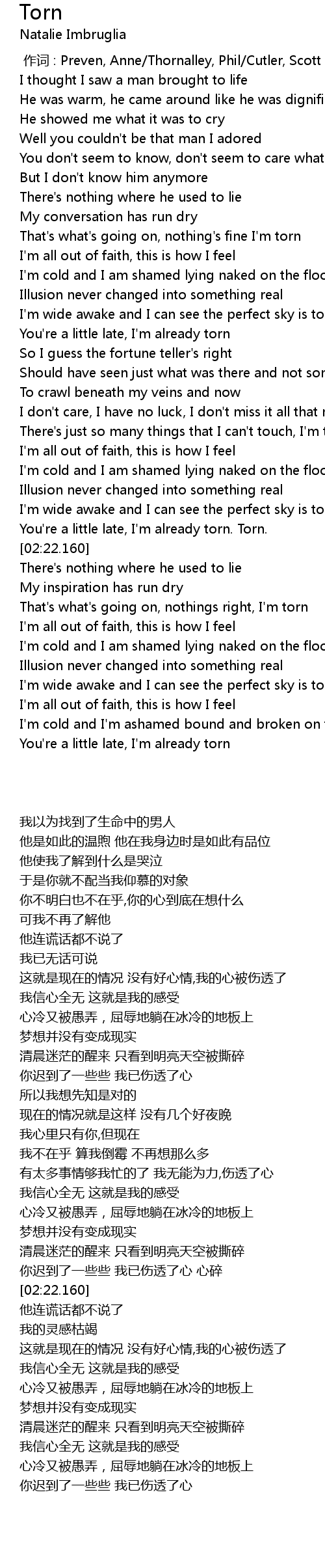 | [02:07.060] | You're a little late, I'm already torn. Torn. |