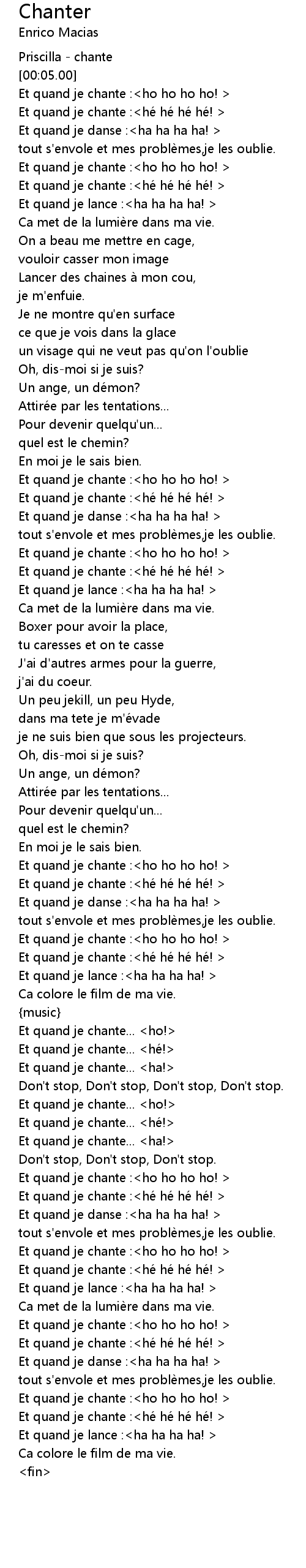 | [01:09.05] | Et quand je chante :<hé hé hé hé! > |