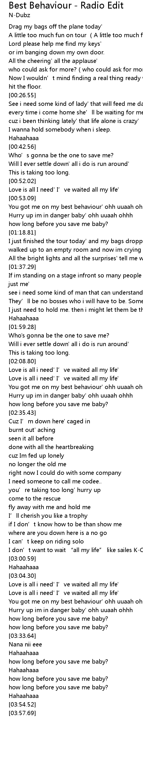 | [03:16.17] | You got me on my best behaviour' ohh uuaah ohhh |