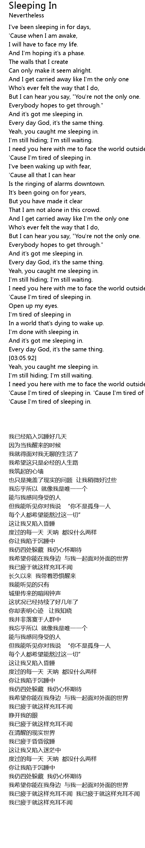 'Cause I'm tired of sleeping in. 'Cause I'm tired of sleeping in. 'Cause I'm tired of sleeping in. |