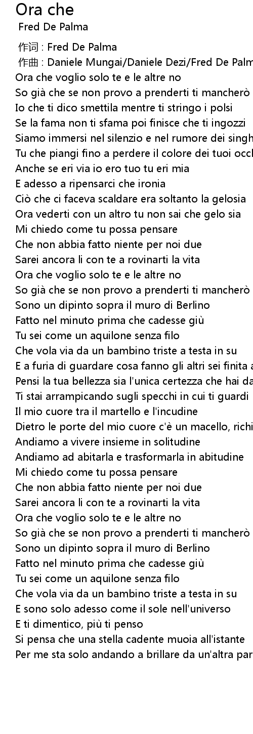 | [00:01.000] | zuò qǔ : Daniele Mungai Daniele Dezi Fred De Palma |