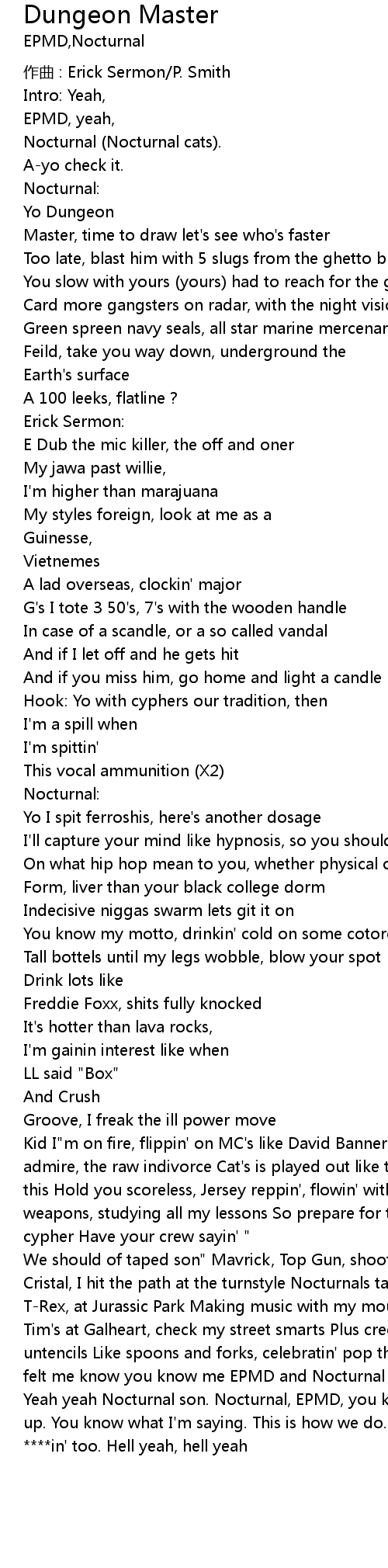 | We should of taped son" Mavrick, Top Gun, shootin' missles I prefer 40' s over Cristal, I hit the path at the turnstyle Nocturnals tactics is wildout like a TRex, at Jurassic Park Making music with my mouth like Biz Mark Rougher than Tim' s at Galheart, check my street smarts Plus credentials, microphones as untencils Like spoons and forks, celebratin' pop the corks Off the Moey if you felt me know you know me EPMD and Nocturnal in your in' ? Hook X4 Outro: Yeah yeah Nocturnal son. Nocturnal, EPMD, you know what' s up, you know what' s up. You know what I' m saying. This is how we do. Reppin' for the crew. Jersey in' too. Hell yeah, hell yeah |