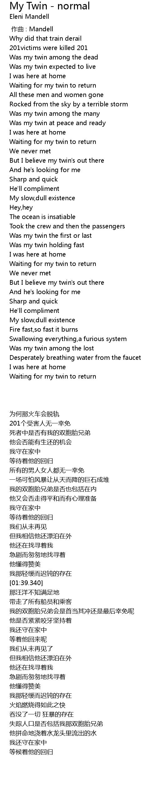 | [00:20.880] | 死者中是否有我的双胞胎兄弟 |