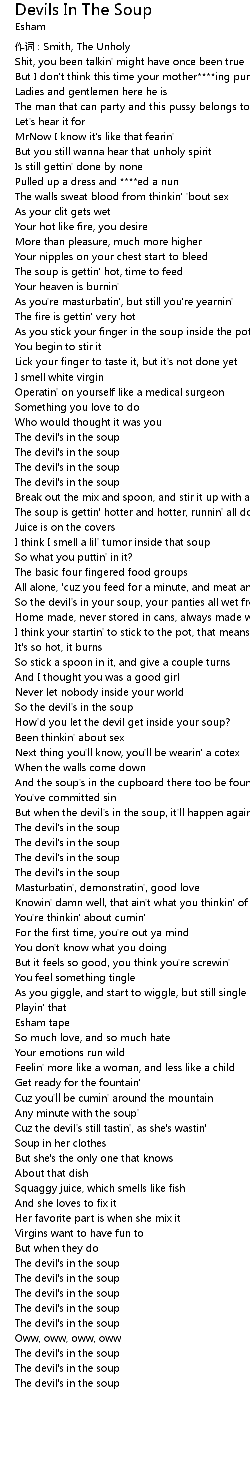| So the devil' s in your soup, your panties all wet from spillin' that soup | |