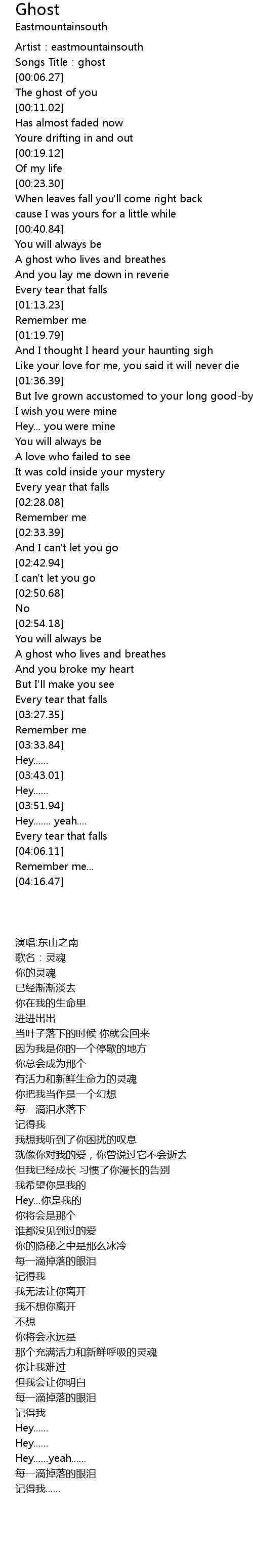| [00:01.27] | Artist:eastmountainsouth |
