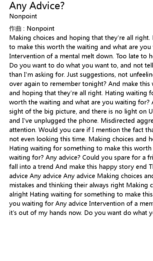 | Making choices and hoping that they' re all right. Hating waiting for something to make this worth the waiting and what are you waiting for? Any advice? Intervention of a mental melt down. Too late to help, it' s out of my hands now. Do you want to do what you want to, and not tell me how? Explanations are more than I' m asking for. Just suggestions, not unfeeling metaphors. No recaps all over again to remember tonight? And make this worth our fight? Making choices and hoping that they' re all right. Hating waiting for something to make this worth the waiting and what are you waiting for? Any advice? We are losing all sight of the big picture, and there is no light on Upstairs there' s nobody home and I' ve unplugged the phone. Misdirected aggression from an obvious lack of attention. Would you care if I mention the fact that im losing my mind? And I' m not even looking this time. Making choices and hoping that they' re all right. Hating waiting for something to make this worth the waiting and what are you waiting for? Any advice? Could you spare for a friend So I don' t do it twice And fall into a trend And make this happy story end There' s a crack in the ice Any advice Any advice Any advice Making choices and hoping that their alright Making mistakes and thinking their always right Making choices and hoping that their alright Hating waiting for something to make this Worth the waiting and what are you waiting for Any advice Intervention of a mental melt down. Too late to help, it' s out of my hands now. Do you want do what you want to, and not tell me how? |