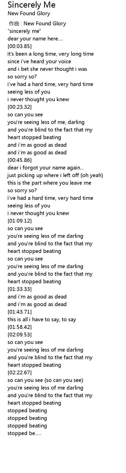 | [00:00.15] | " sincerely me" |