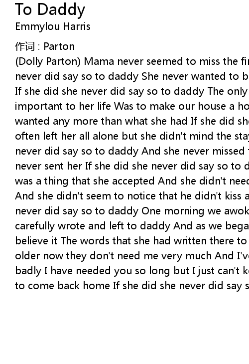 | Dolly Parton Mama never seemed to miss the finer things of life If she did she never did say so to daddy She never wanted to be more than a mother and a wife If she did she never did say so to daddy The only thing that seemed to be important to her life Was to make our house a home and make us happy Mama never wanted any more than what she had If she did she never did say so to daddy He often left her all alone but she didn' t mind the staying home If she did she never did say so to daddy And she never missed the flowers and the cards he never sent her If she did she never did say so to daddy Being took for granted was a thing that she accepted And she didn' t need those things to make her happy And she didn' t seem to notice that he didn' t kiss and hold her If she did she never did say so to daddy One morning we awoke just to find a note That mama carefully wrote and left to daddy And as we began to read it Our ears could not believe it The words that she had written there to daddy She said the kids are older now they don' t need me very much And I' ve gone in search of love I need so badly I have needed you so long but I just can' t keep holding on She never meant to come back home If she did she never did say so to daddy Goodbye to daddy |