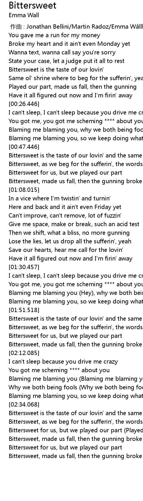 | [03:03.350] | Bittersweet, made us fall, then the gunning broke it off |