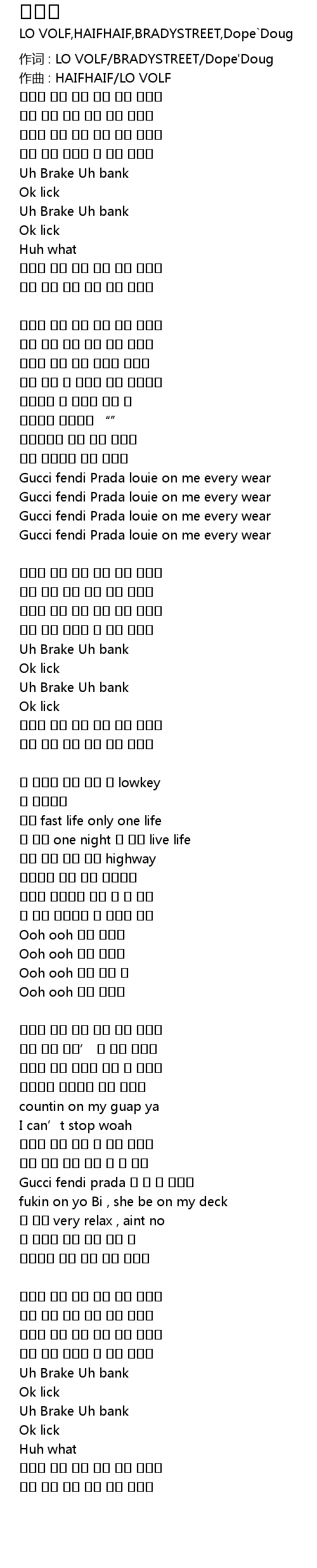 作词 : LO VOLF/BRADYSTREET/Dope'Doug |