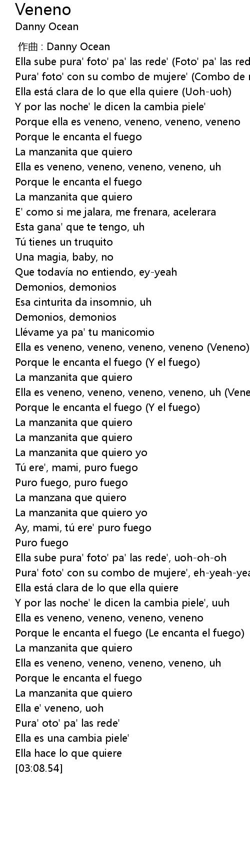| [01:21.44] | Ella es veneno, veneno, veneno, veneno Veneno |