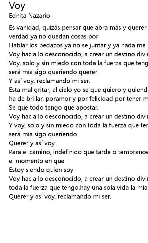 | Voy hacia lo desconocido, a crear un destino divinoy voy, solo y sin miedo con toda la fuerza que tengo, hay una sola vida la mi a sera mi a sigo queriendo | |