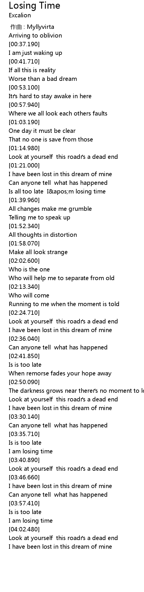 | [01:32.380] | Is all too late I'm losing time |