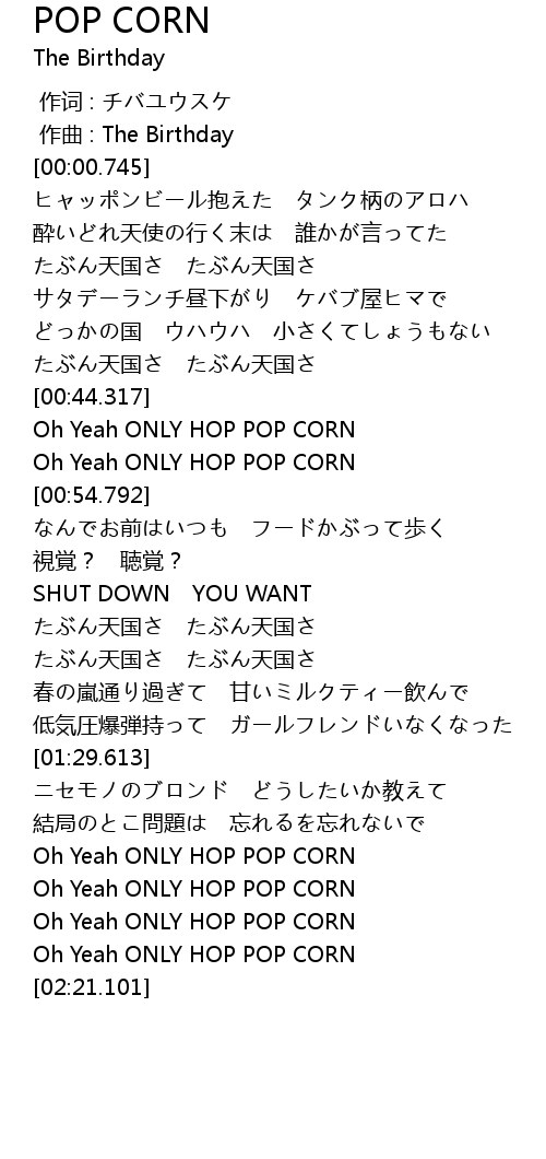 | [02:15.589] | Oh Yeah ONLY HOP POP CORN |