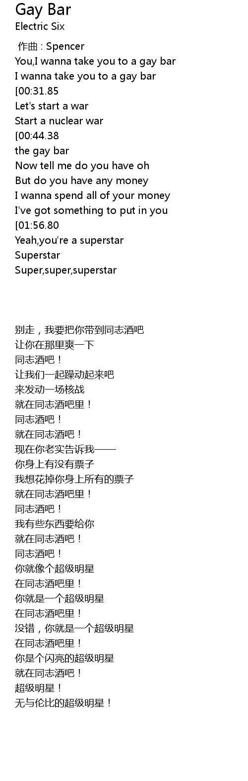 | [00:20.71][00:31.85][01:05.61][01:36.19] | Gay bar, gay bar |