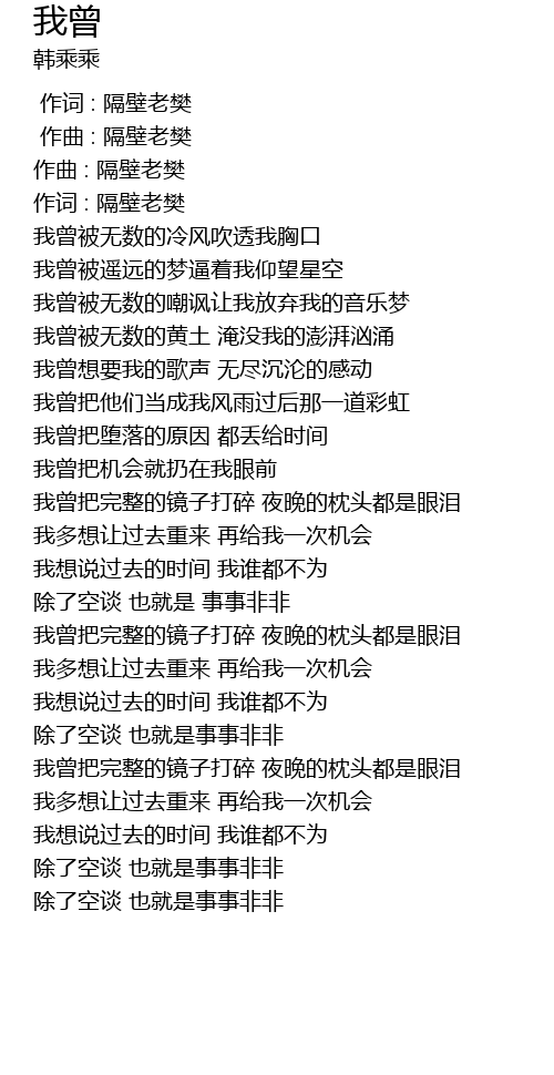| [00:00.000] | 作词 : 隔壁老樊 |