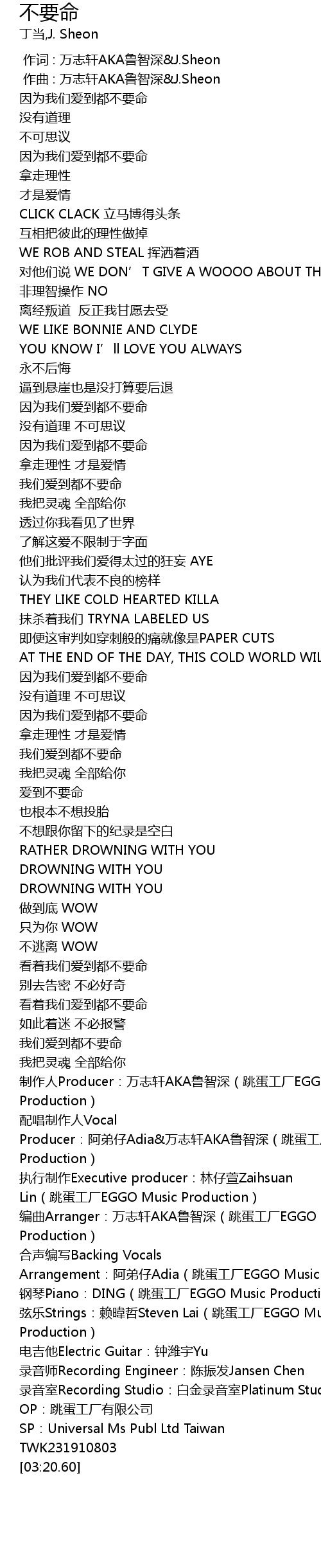 | [03:17.87] | 执行制作Executive producer:林仔萱Zaihsuan Lin(跳蛋工厂EGGO Music Production) |