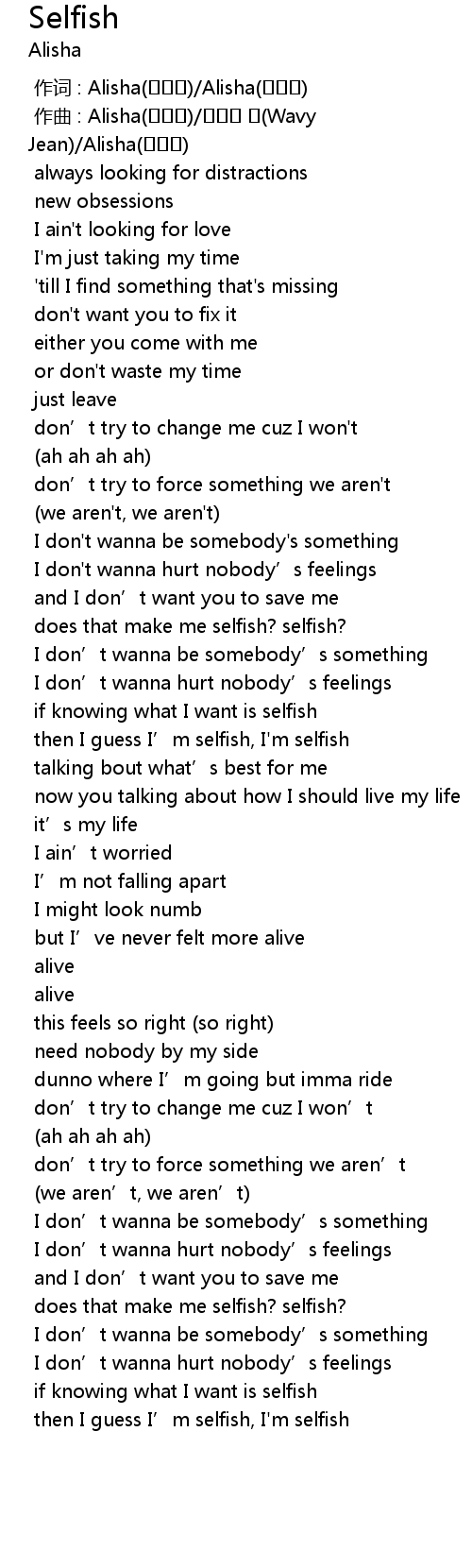 | [01:02.115] | then I guess I' m selfish, I' m selfish |